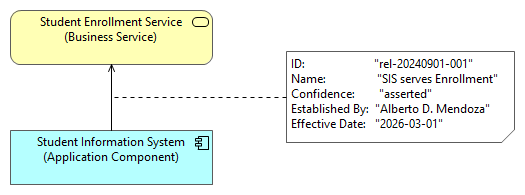 myModel:StudentEnrollmentService rdf:type archimate:BusinessService .myModel:StudentInformationSystem rdf:type archimate:ApplicationComponent .<< myModel:StudentInformationSystem archimate:serving myModel:StudentEnrollmentService >> archimate:identifier "rel-20240901-001" ; archimate:name "SIS serves Enrollment" ; archimate:confidence "asserted" ; myModel:establishedBy "Alberto D. Mendoza" ; myModel:effectiveDate "2026-03-01"^^xsd:date .